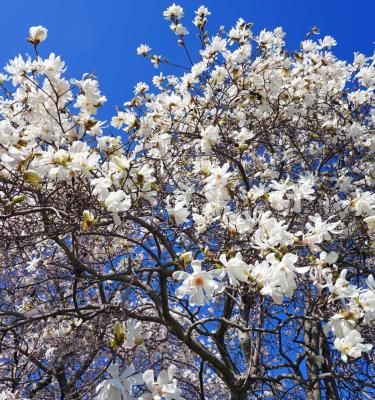 - Magnolia stellata – a shrubby small tree with starry white flowers in spring on bare branches. A good choice for alkaline soils.
