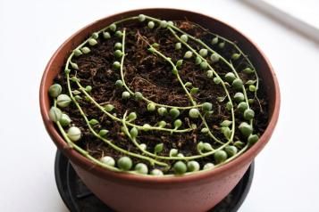 - Steckling vorbereiten: Schneide einen gesunden Trieb ab und entferne die unteren Perlen, sodass ein freies Stück Stängel entsteht.