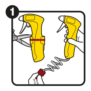1. Plastikband am Sprühkopf durchschneiden