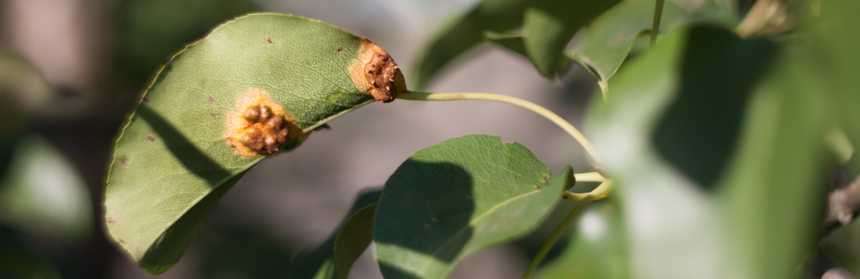 • uszkodzenia liści gruszy – tam, gdzie występują plamki i narośle liście twardnieją, a z czasem odpadają (zazwyczaj przedwcześnie);