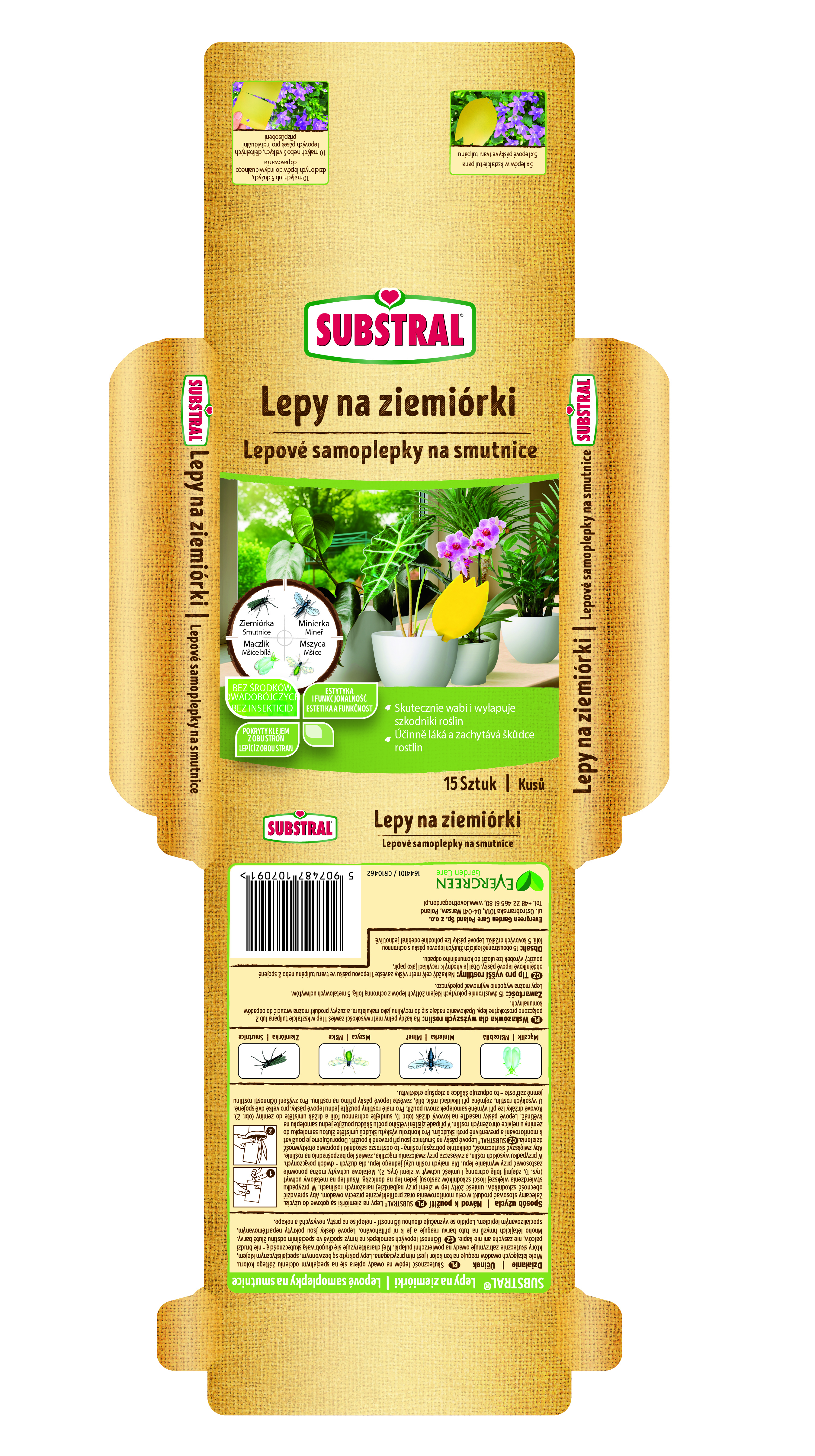 Skuteczność lepów na owady SUBSTRAL® opiera się na specjalnym odcieniu żółtego koloru. Wiele latających owadów reaguje na ten kolor i jest nim przyciągana. Lepy pokryte są bezwonnym, specjalistycznym klejem, który skutecznie zatrzymuje owady na powierzchni pułapki. Klej charakteryzuje się długotrwałą skutecznością – nie brudzi palców, nie zasycha ani nie kapie. Skuteczne na takie owady jak mączlik, minierka, mszyca, ziemiórka.