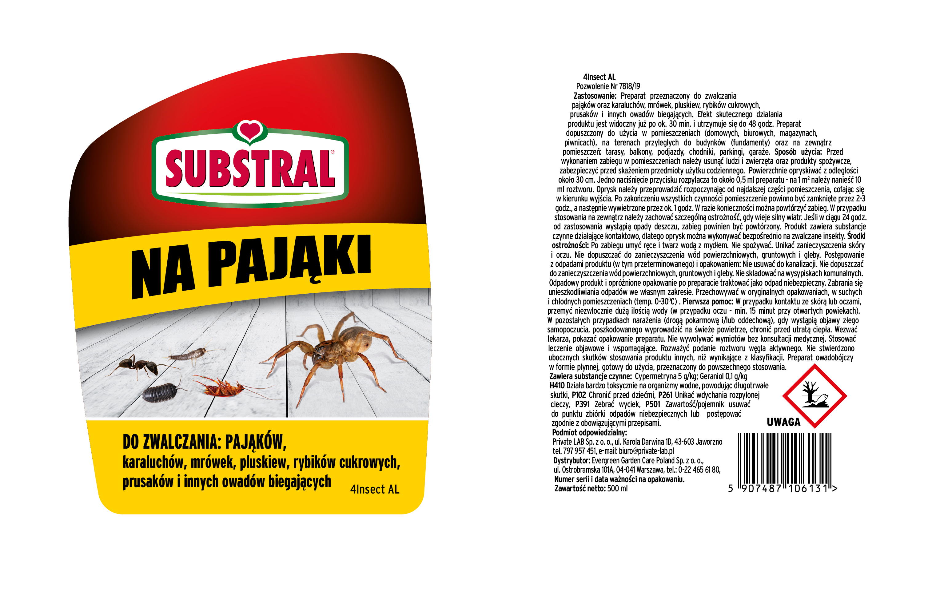Substral na Pająki. Zwalcza pająki. Specjalny preparat zarejestrowany przeciwko pająkom. Do stosowania na zewnątrz i wewnątrz. Gotowy do użycia produkt w formie sprayu. Natychmiastowy efekt.