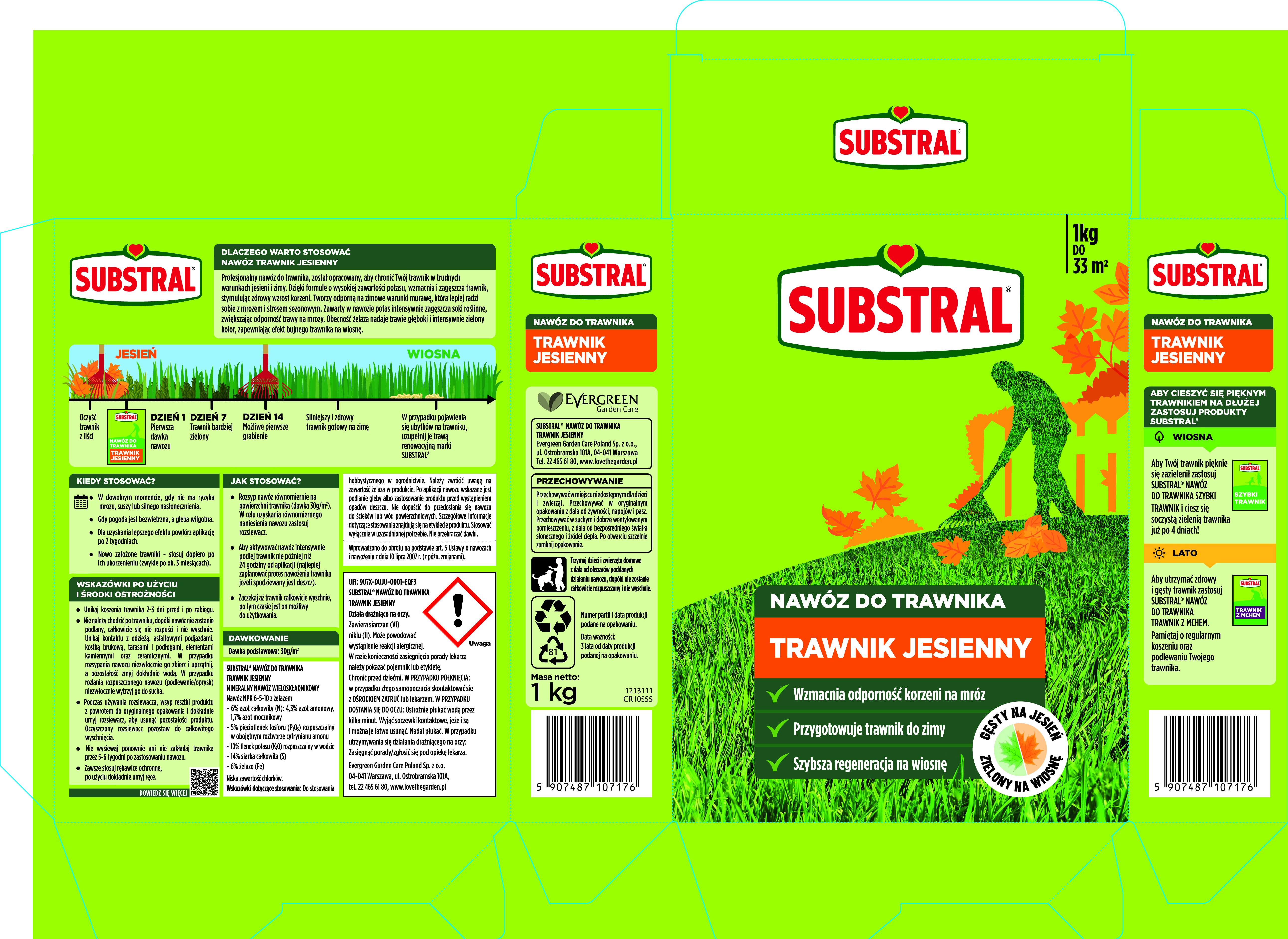 SUBSTRAL® Nawóz Trawnik Jesienny to profesjonalny nawóz do trawnika, który został opracowany, aby chronić Twój trawnik w trudnych warunkach jesieni i zimy. Dzięki formule o wysokiej zawartości potasu, wzmacnia i zagęszcza trawnik, stymulując zdrowy wzrost korzeni. Tworzy odporną na zimowe warunki murawę, która lepiej radzi sobie z mrozem i stresem sezonowym. Zawarty w nawozie potas intensywnie zagęszcza soki roślinne, zwiększając odporność trawy na mrozy. Obecność żelaza nadaje trawie głęboki i intensywnie zielony kolor, zapewniając efekt bujnego trawnika na wiosnę.
