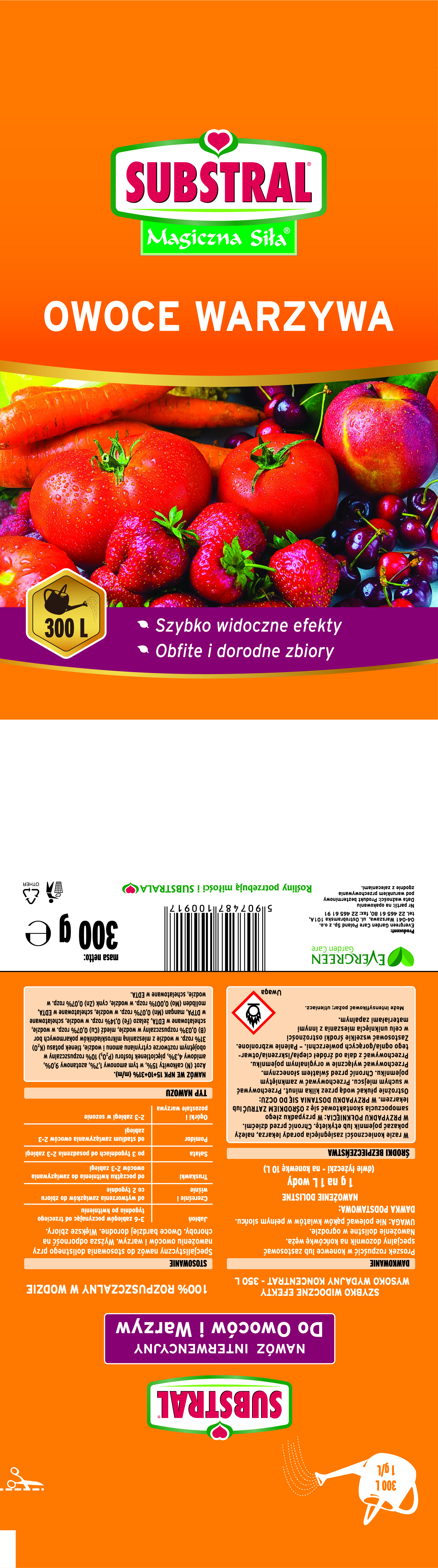 Substral Magiczna Siła to specjalistyczny nawóz do owoców i warzyw. Zapewnia wyższą odporność na choroby, bardziej dorodne owoce i większe zbiory, szybko widoczne efekty. Nawóz można stosować raz w tygodniu, jego aplikacja jest prosta i wygodna - łączy podlewanie z nawożeniem. Wysoko wydajny koncentratsprawia, że opakowanie wystarczy nawet na kilkaset litrów wody. Nawóz jest łatwo przyswajalny przez rośliny, nie grozi przenawożeniem i wypaleniem, zapewnia szybkie i widoczne efekty. Specjalna mieszanka bogata w makro i mikroelementy zaspokoi wszystkie potrzeby twoich owoców i warzyw.