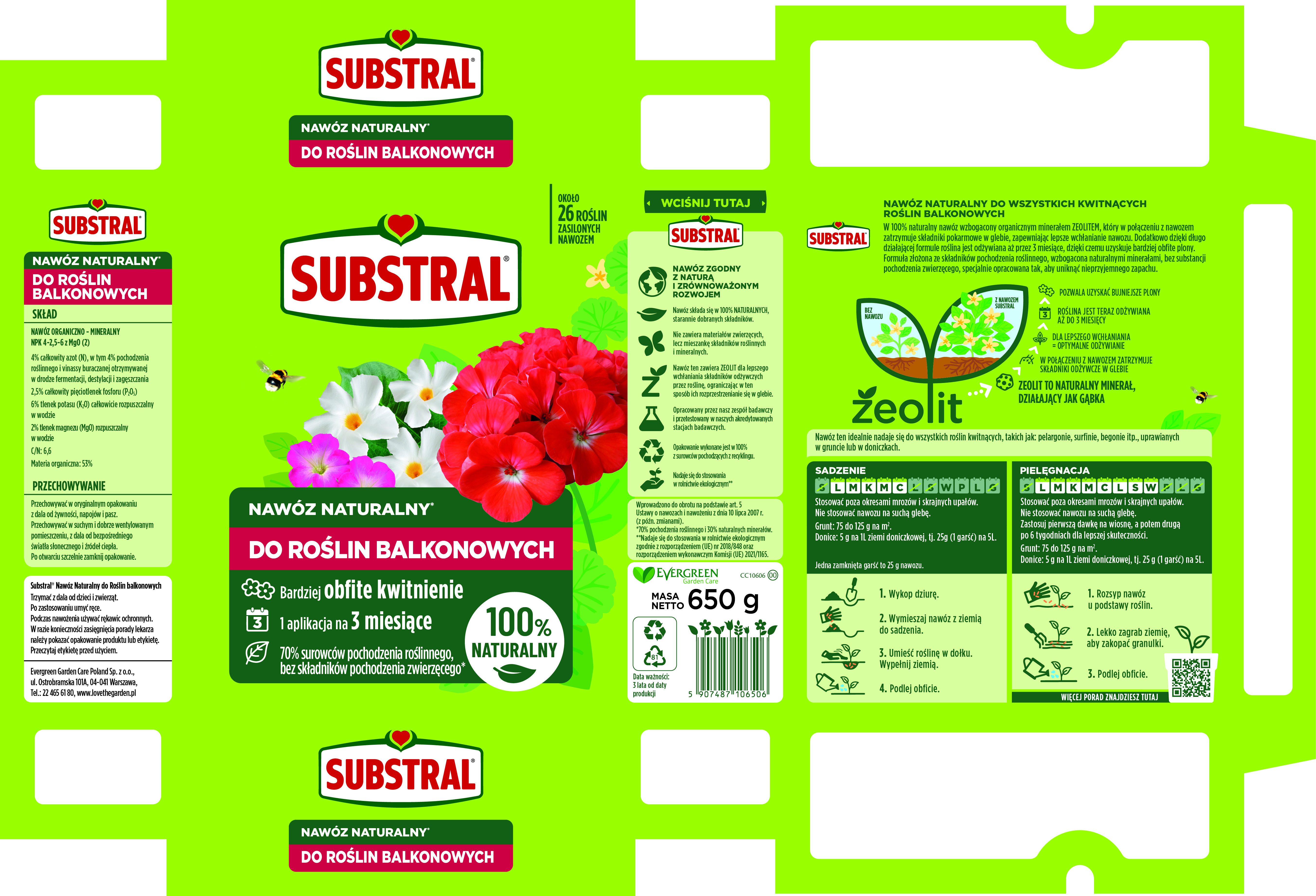 Nawóz naturalny do roślin balkonowych. Zapewnia bardziej obfite kwitnienie. Wzbogacony zeolitem, który zatrzymuje wodę i składniki pokarmowe w glebie. Długie działanie do 3 miesięcy.