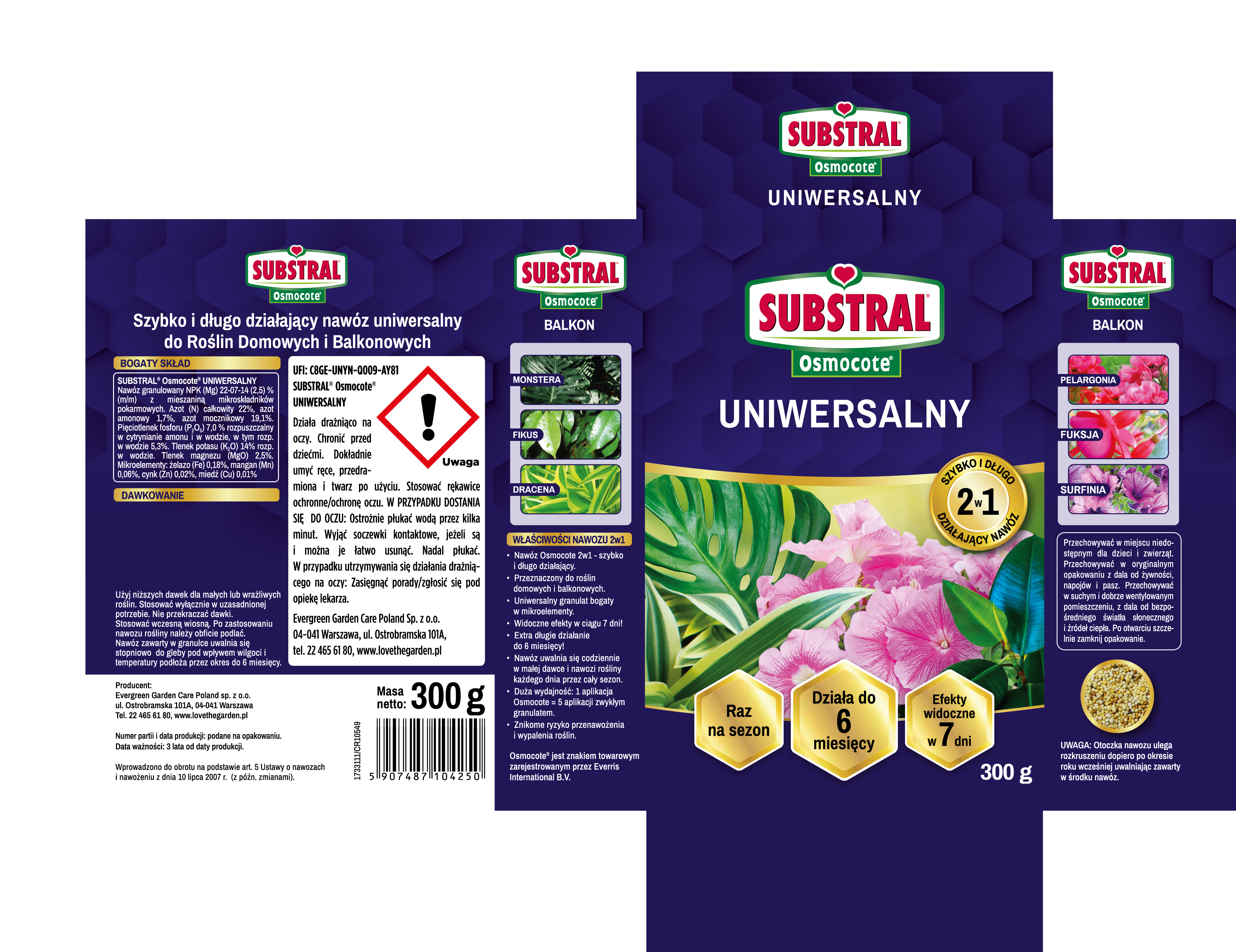 SUBSTRAL Osmocote 2w1 Uniwersalny przeznaczony jest do roślin domowych (Monstera, Fikus, Dracena i Zamiokulkas)i balkonowych (Begonia, Pelargonia, Fuksja, Surfinia).
