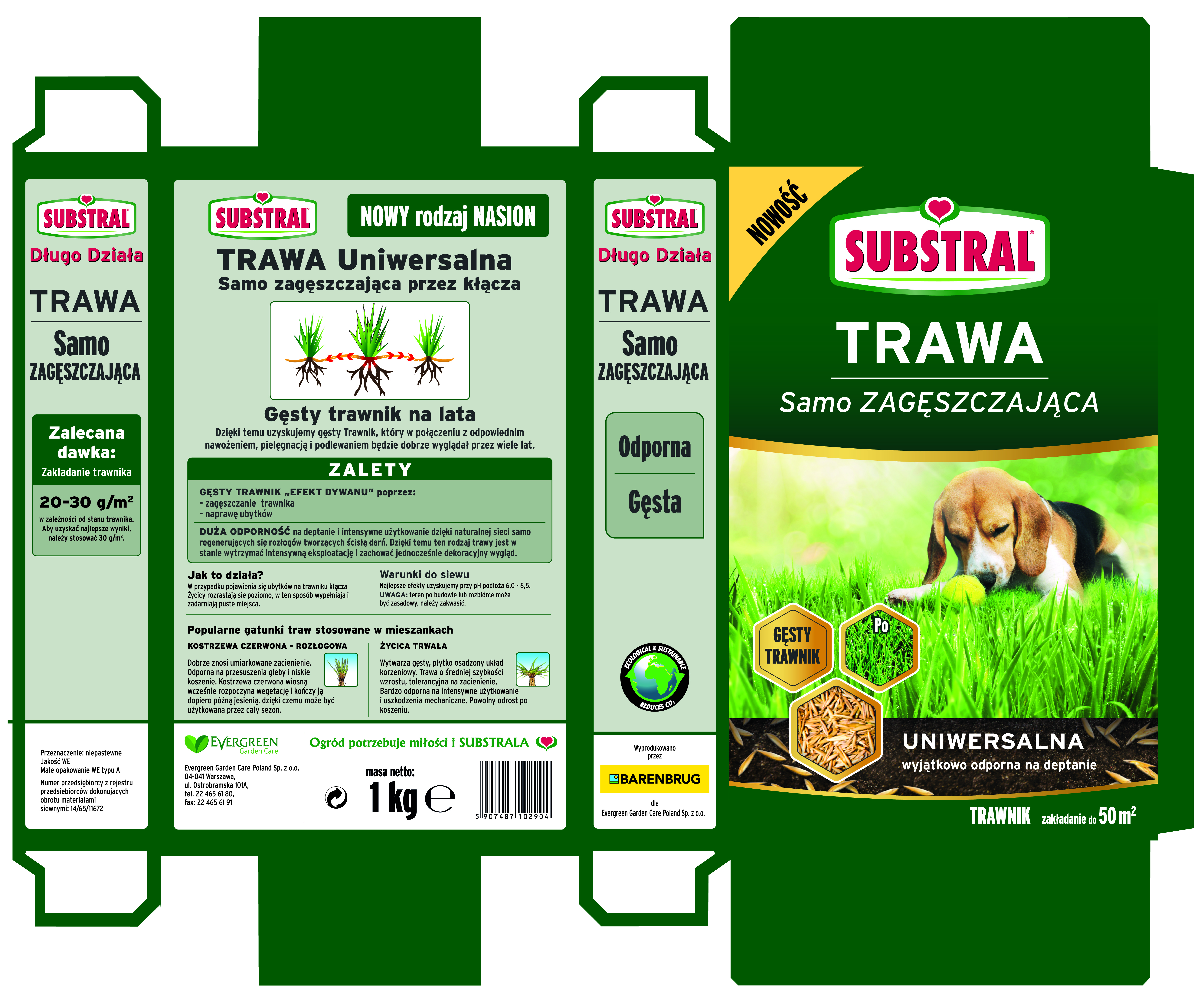 Substral trawa samozagęszczająca Uniwersalna. Szybko zadarniania wolne powierzchnie i ubytki na trawniku. Tworzy zwartą, gęstą i bujną darń. Zapewnia wysoką odporność trawnika na deptanie i intensywne użytkowanie, intensywny wzrost i ciągłe „odmładzanie” się trawnika. Tworzy naturalną barierę dla mchu i chwastów na trawniku. Bardziej odporna na przemarzanie - trawnik lepiej przetrzyma zimę. Można kosić trawę znacznie niżej - nisko międzywęźla. Kiełkuje w niższych temperaturach.