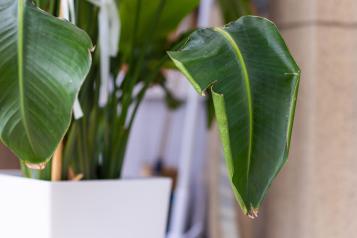 Suche, brązowe brzegi lub końcówki liści to sygnał, że powietrze wokół rośliny jest zbyt suche. Problem nasila się zimą, gdy pracują grzejniki, oraz latem podczas upałów.